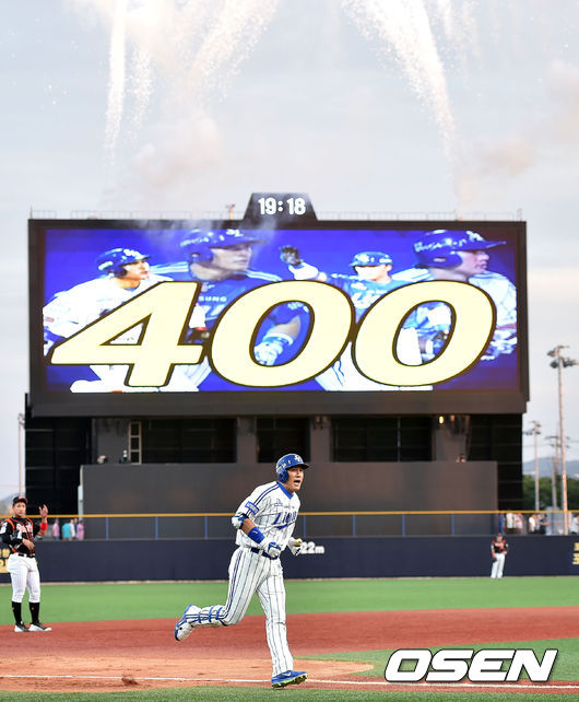 '국민타자' 이승엽(삼성)이 개인 통산 400홈런 고지를 밟았다. 이승엽은 3일 포항구장에서 열린 롯데 자이언츠와의 경기에 6번 지명타자로 선발 출장, 3회 롯데 선발 구승민에게서 홈런을 빼앗았다. 시즌 10호째이자 개인 통산 400호째 홈런. 한국프로야구의 새 역사를 쓰는 순간이었다. 이승엽의 홈런 신기록의 의미를 숫자로 풀었다.
