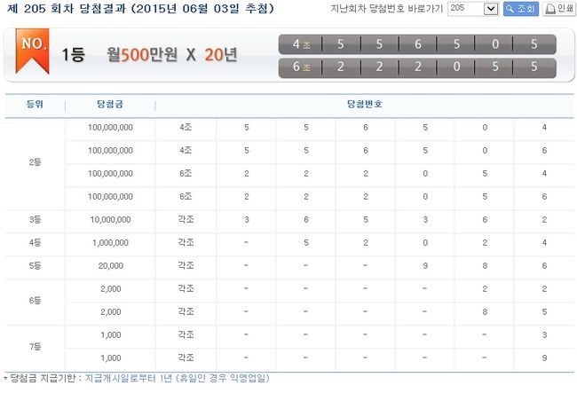 발표에 따르면 제 205회차 1등 당첨번호는 '4조 556505번'과 '6조 222055번'이다.