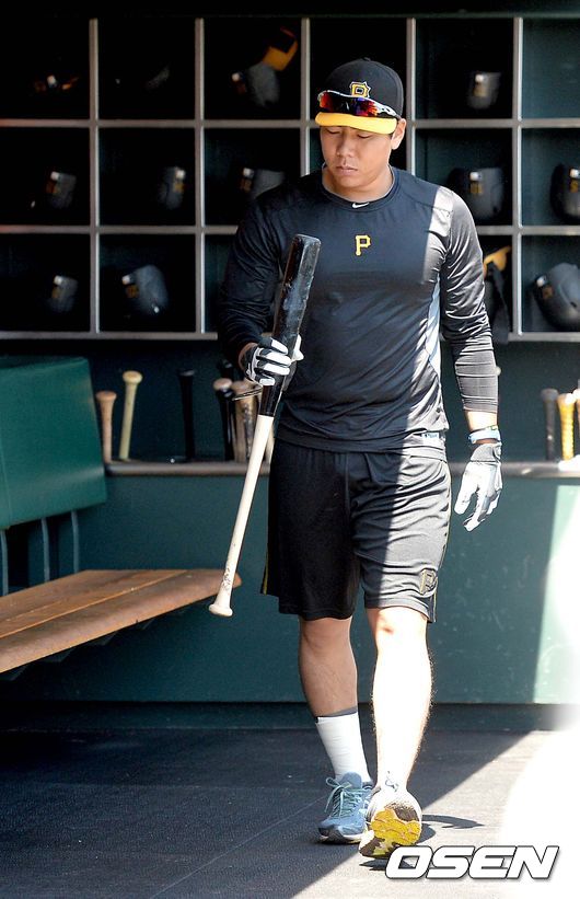 4일(한국시간) 미국 캘리포니아주 샌프란시스코 AT&T파크에서 열리는 '2015 메이저리그' 샌프란시스코 자이언츠와 피츠버그 파이어리츠의 경기를 앞두고, 피츠버그 강정호가 실내 타격 훈련을 위해 배트를 들고 이동하고 있다.