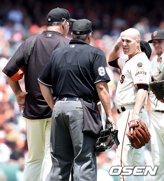 3회초 피츠버그 공격 1사 주자없는 상황 조디 머서의 땅볼 타구에 샌프란시스코 선발 팀 허드슨이 몸을 맞았다. 이후 상태를 살피며 대화를 나누는 허드슨과 감독 브루스 보치.