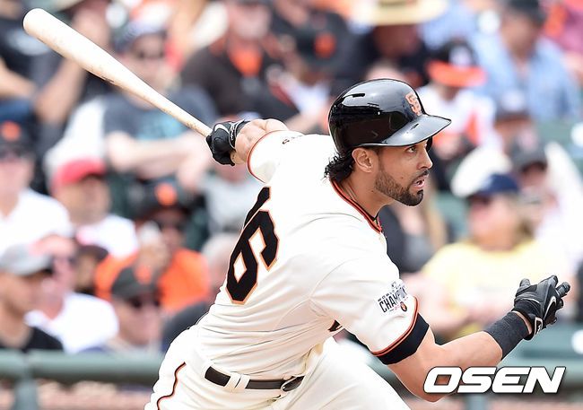6회말 샌프란시스코 공격 2사 주자없는 상황 앙헬 파간이 중전 안타를 날리고 있다.