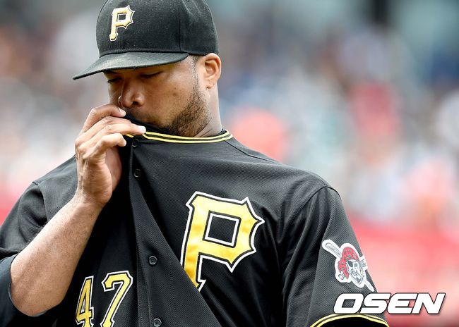 7회말 샌프란시스코 공격 2사 1, 2루 상황 브랜든 크로포드를 내야 땅볼로 이끌며 실점없이 이닝을 막아낸 피츠버그 선발 프란시스코 리리아노가 더그아웃으로 향하고 있다.