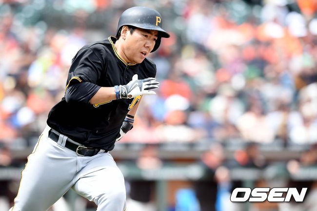 9회초 피츠버그 공격 1사 2, 3루 상황 대타로 들어선 강정호가 적시 좌익수 방면 2타점 2루타를 날리고 전력 질주 하고 있다.