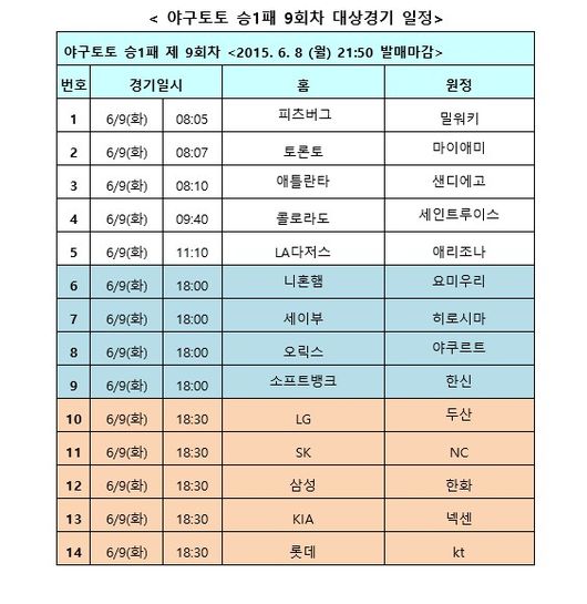 국민체육진흥공단(www.kspo.or.kr)이 발행하는 체육진흥투표권 수탁사업자인 스포츠토토(www.sportstoto.co.kr)는 오는 9일(화)에 벌어지는 국내 프로야구(KBO) 5경기 및 미국프로야구(MLB) 5경기, 일본프로야구(NPB) 4경기 등 총 14경기를 대상으로 한 야구토토 승1패 9회차 게임을 발행한다고 밝혔다.