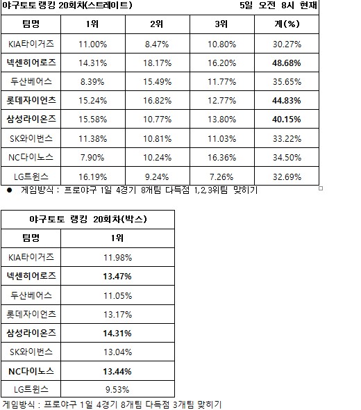 이번 야구토토 랭킹 20회차 게임은 경기시작 10분전인 6일 오후 4시 50분에 발매가 마감되며, 경기가 모두 종료된 후에 결과가 공식 발표된다.