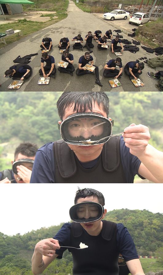 촬영 당시 멤버들을 진정 당황하게 한 훈련은 바로 점심 식사 시간이었다. 점심시간이 되자 교관들은 모두에게 마스크를 착용하라고 지시했고, 이내 모두의 마스크 안에 물을 채운 후 식사 시작을 허락했다.