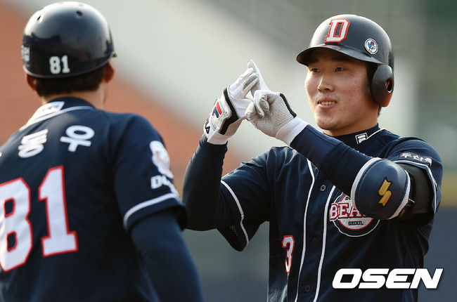6일 오후 서울 목동구장에서 열린 '2015 타이어뱅크 KBO 리그' 넥센 히어로즈와 두선 베어스의 경기 2회초 1사 2루 허경민이 1타점 적시타를 치고 기뻐하고 있다.