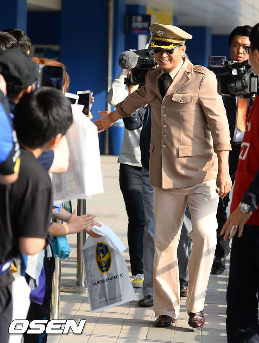 경기에 앞서, 지난 4월 리그 첫 승 공약으로 맥아더 장군 코스튬을 약속했던 김도훈 감독이 맥아더 장군 복장을 입고 사인회 장소로 발걸음을 옮기고 있다.