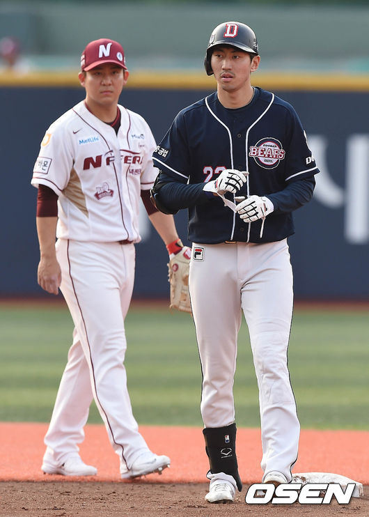 6일 오후 서울 목동구장에서 열린 '2015 타이어뱅크 KBO 리그' 넥센 히어로즈와 두선 베어스의 경기 4회초 1사 2루 정진호가 1타점 2루타를 치고 2루 베이스에 서 있다.
