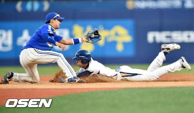 6일 오후 창원시 마산 야구장서 열린 '2015 타이어뱅크 KBO 리그' NC 다이노스와 삼성 라이온스의 경기, 7회말 무사 주자 1루 NC 이종욱의 삼진아웃때 1루 주자 최재원이 2루 도루에 성공하고 있다.