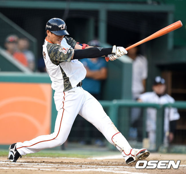 6회말 무사 1,2루에서 한화 신성현이 좌전 안타를 치고 있다.