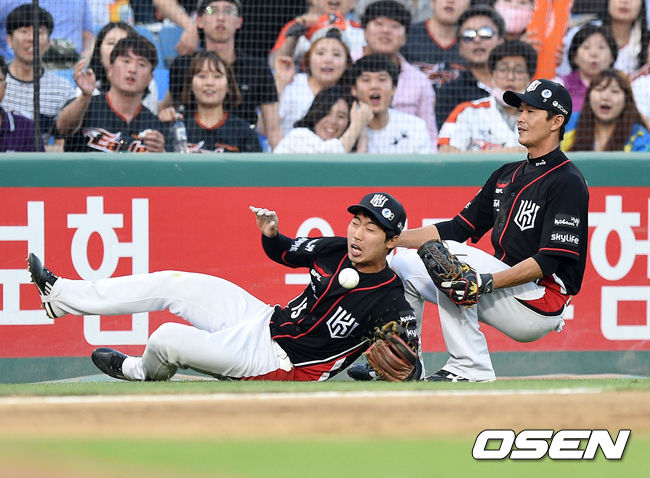 6회말 무사 만루에서 kt 이지찬과 박기혁이 한화 이용규의 파울 타구를 잡으려다 충돌하고 있다.