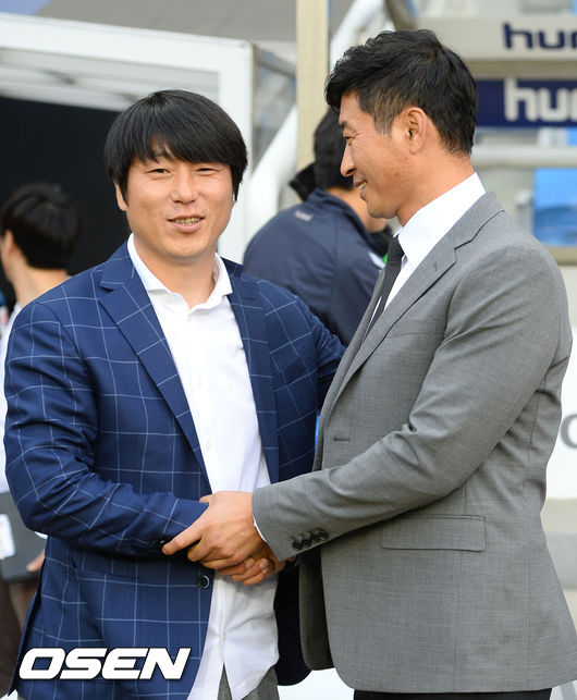 경기에 앞서 전남 노상래 감독과 인천 김도훈 감독이 인사를 나누고 있다.