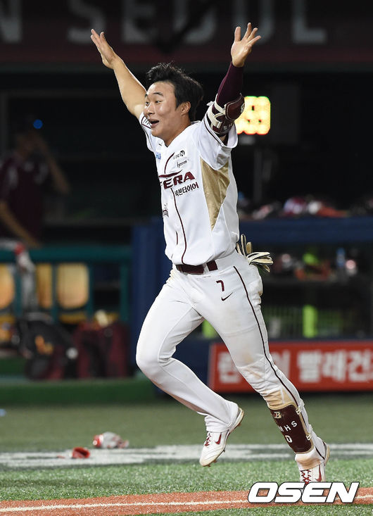 6일 오후 서울 목동구장에서 열린 '2015 타이어뱅크 KBO 리그' 넥센 히어로즈와 두선 베어스의 경기 10회말 1사 김하성이 끝내기 솔로포를 치고 홈으로 향하고 있다.