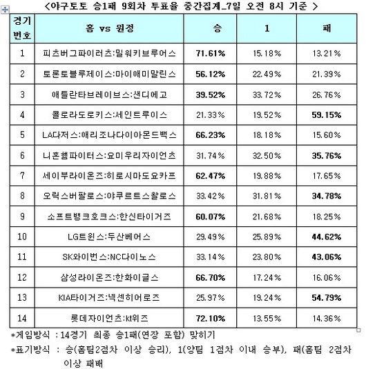 야구토토 승1패 9회차 투표율 중간 집계 결과… 삼성, 한화에 승리 전망
