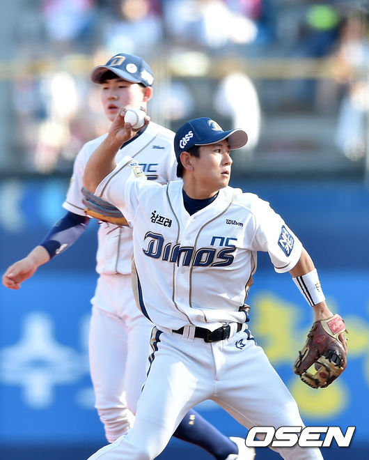 7일 오후 창원시 마산 야구장서 열린 '2015 타이어뱅크 KBO 리그' NC 다이노스와 삼성 라이온스의 경기, 2회초 무사 주자 1루 삼성 이승엽의 2루수 앞 땅볼타구 때 NC 유격수 손시헌이 병살로 연결하고 있다.