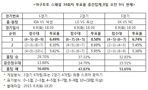 [야구토토] 국민체육진흥공단(www.kspo.or.kr)이 발행하는 체육진흥투표권 공식 온라인 발매 사이트 베트맨(www.betman.co.kr)이 9일에 열리는 2015시즌 한국프로야구(KBO) 3경기를 대상으로 한 야구토토 스페셜 34회차 투표율을 중간 집계한 결과, 참가자의 56.60%는 KIA-넥센(1경기)전에서 넥센의 승리를 예상했다.