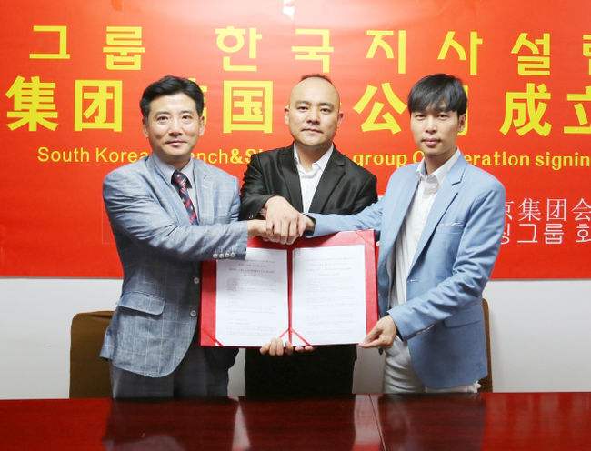 중국 안휘성 5대 그룹사중 하나인 상징그룹(회장 한군)이 이달 중 런칭할 예정인 한류직구 인터넷쇼핑몰 '마이한왕'과 한류 프랜차이즈 사업확대를 위해 한국과 공동으로 상징그룹 한국지사 '상징그룹코리아'를 설립한다고 8일 발표했다. 사진 왼쪽부터 이재희 상징그룹코리아 사장, 한군 상징그룹 회장, 김병현 상징그룹 한국총괄 부회장. / 상징그룹
