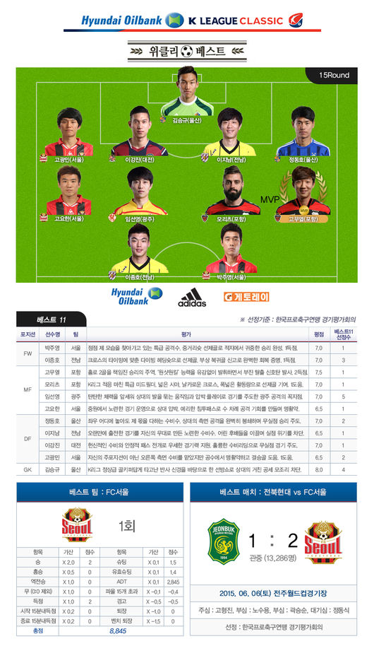 베스트 팀에는 서울이, 베스트 매치에는 지난 6일 전주월드컵경기장에서 열린 전북과 서울(2-1 승)의 경기가 선정됐다.