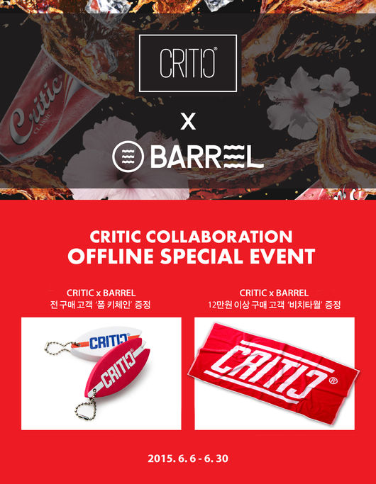 스트릿 브랜드 크리틱(CRITIC)이 워터 액션 스포츠웨어 브랜드 배럴(BARREL)과 콜라보레이션 라인 출시를 기념, 특별 이벤트를 진행한다.