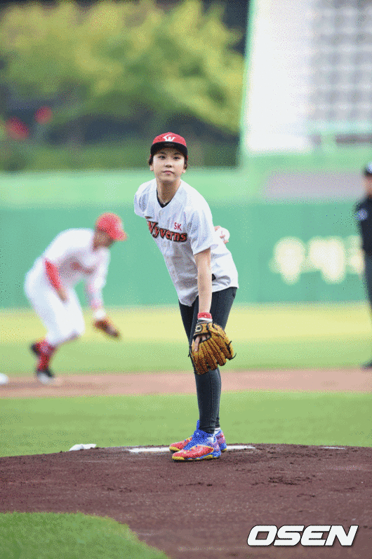 경기에 앞서 배우 박지아가 시구를 하고 있다.