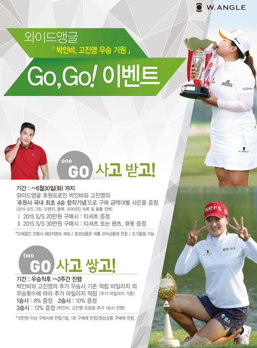 북유럽 감성의 골프웨어 와이드앵글(대표 정영훈, http://www.wide-angle.co.kr/)이 소속 후원 선수 박인비(27, KB금융그룹)와 고진영(20, 넵스)의 시즌 2승을 기념해 '우승 기원 Go, Go' 이벤트를 실시한다.