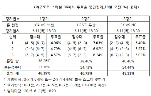 [야구토토] 국민체육진흥공단(www.kspo.or.kr)이 발행하는 체육진흥투표권 공식 온라인 발매 사이트 베트맨(www.betman.co.kr)이 11일에 열리는 2015시즌 한국프로야구(KBO) 3경기를 대상으로 한 야구토토 스페셜 36회차 투표율을 중간 집계한 결과, 참가자의 46.78%는 LG-두산(2경기)전에서 두산이 LG에 승리할 것이라 예상했다.