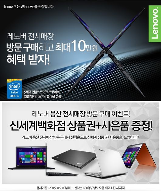 또한 씽크패드 T450, T550, X250, 씽크패드 요가 시리즈 구매자 30명에게는 신세계 5만원 상품권, 씽크패드E시리즈와 G50-80, Z50-70 구매자 100명에게는 신세계 상품권 3만원을 제공한다.