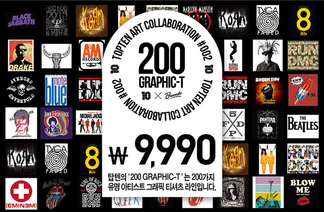 탑텐은 본격적인 여름 시즌을 맞아 200가지의 그래픽 티셔츠 중 새로운 스타일의 새로운 그래픽 티셔츠를 추가로 선보였다. 탑텐의 유니버셜 그래픽 티셔츠는 작년에 이어 올해에도 200가지 스타일의 아티스트 콜래보레이션 그래픽 티셔츠이다. 가격은 9900원.