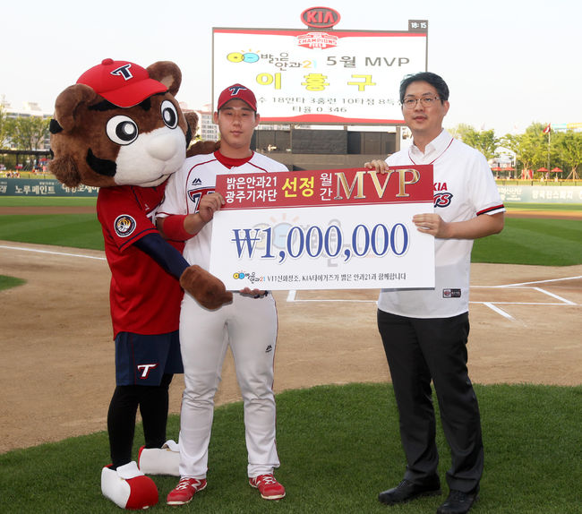 MVP에 선정된 이홍구는 10일 광주-기아 챔피언스필드에서 열린 '2015 타이어뱅크 KBO 리그' 넥센 히어로즈전에 앞서 시상식을 가졌다. 이날 밝은안과21병원 최성호 원장이 직접 시상했고, 시상금 100만원을 전달했다.