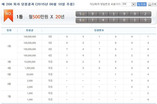 2등은 각 1등의 맨 끝자리 앞뒤 번호로 당첨금 1억원을 받는다. 당첨번호는 '5조 931991번', '5조 931993번', '6조조 747018번' '6조 747020'이다.