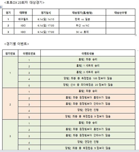 이번 토토OX 23회차에서는 1경기의 경우 홈팀의 최종 승리, 1세트와 3세트 승리 여부, 양팀 최종 총 득점합, 양팀 선주 중 최다득점 20득점보다 많음이 지정됐다. 2~3경기에서 펼쳐지는 5가지 이벤트에는 홈팀 최종 승리와 홈팀이 최종 원정팀 보다 홈런 수가 많음, 홈팀이 최종 원정팀 보다 안타 수가 많음, 양팀 연장전 진행, 양팀 최종 총 득점합은 9점보다 많음이 선정됐다.