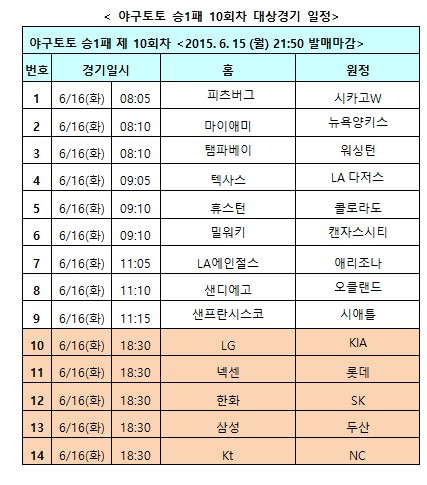 국민체육진흥공단(www.kspo.or.kr)이 발행하는 체육진흥투표권 수탁사업자인 스포츠토토(www.sportstoto.co.kr)는 오는 16일(화)에 벌어지는 국내 프로야구(KBO) 5경기 및 미국프로야구(MLB) 9경기 등 총 14경기를 대상으로 한 야구토토 승1패 10회차 게임을 발행한다고 밝혔다.