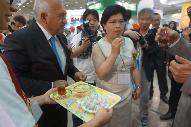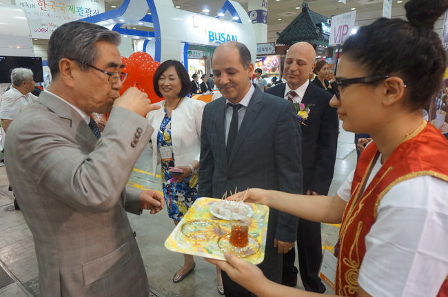 제 30회 한국국제관광전에 참여한 터키문화관광부 부스에서 터키 젤리 로쿰과 터키 차이티를 맛보고 있는 신중목 (주)코트파회장(맨 좌측), 나은경 터키문화관광부 한국홍보사무소대표(좌측 두번째), 알리 카라쿠쉬 터키문화관광부 동북아지역본부국장(가운데), 카안 퀵 투르키 상업무관.(우측 두번째) 아래는 제 30회 한국국제관광전에 참여한 터키문화관광부 부스에서 터키 젤리 로쿰과 터키 차이티를 소개하고 있는 아르슬란 하칸 옥찰 주한 터키 대사.(맨 왼쪽) / 터키문화관광부 제공