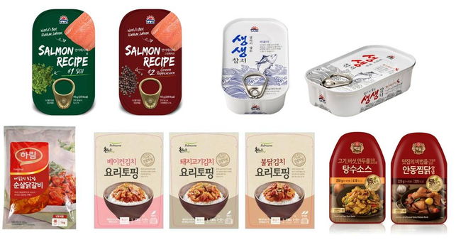 (왼쪽 위부터 시계방향 순) 사조해표 '연어레시피' 2종, '생생참치' 2종, CJ제일제당 '백설 안동찜닭양념', '백설 탕수소스', 풀무원식품 '볶음김치 요리토핑 3종', 하림 '하림 매실숙성 토종닭 순살닭갈비'