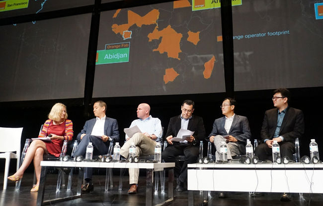 경기창조경제혁신센터 임덕래 센터장(우측에서 2번째)이 지난 11일(현지기준) 프랑스에서 개최된 The Orange Fabs’ International Demo Day에 참석해 오렌지텔레콤, 싱가폴 싱텔 등 주요 사업자들과 함께 스타트 업 에코시스템 관련 내용 토의를 하고 있는 모습이다. 아래는 ‘이리언스’의 황정훈 본부장이 해외 바이어에게 홍채인증 결제시스템을 시연하고 있다. / KT 제공