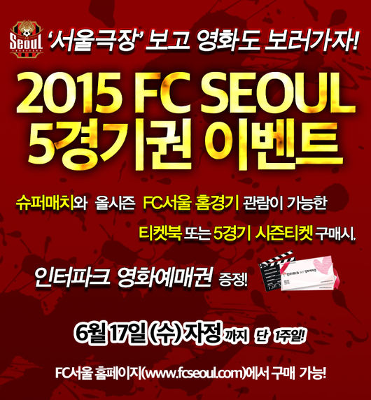 FC서울은 6월 17일 수요일까지 일주일간 FC서울 홈페이지에서 5경기권을 구매한 팬들에게 구매 수량만큼 인터파크 영화예매권을 증정할 예정이다.