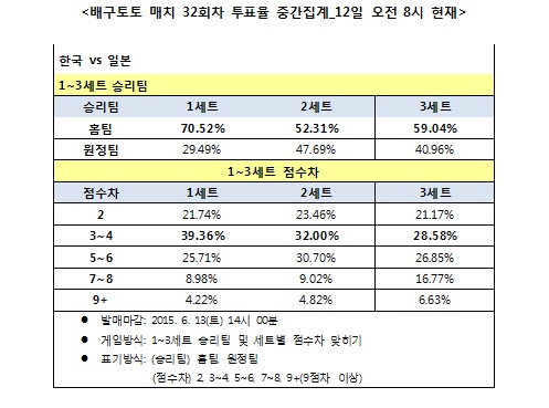 국민체육진흥공단(www.kspo.or.kr)이 발행하는 체육진흥투표권 공식 온라인 발매사이트 베트맨(www.betman.co.kr)은 오는 13일(토) 수원실내체육관에서 열리는 2015 월드리그 국제남자배구대회 한국-일본전을 대상으로 하는 배구토토 매치 32회차 게임 투표율 중간집계 결과, 배구팬들은 홈팀 한국이 원정팀 일본을 상대로 우세한 경기를 펼칠 것으로 예상했다.
