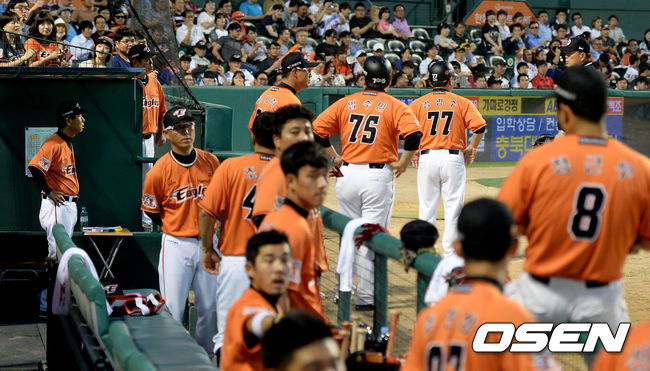 3회말 2사 1,2루에서 대타로 나선 한화 김태완이 삼진으로 물러나자 김성근 감독이 문승훈 구심에 스트라이크 판정에 불만을 나타내고 있다. 김성근 감독은 4회초 수비에 들어가기 전 선수들을 그라운드에 내보내지 않았다.