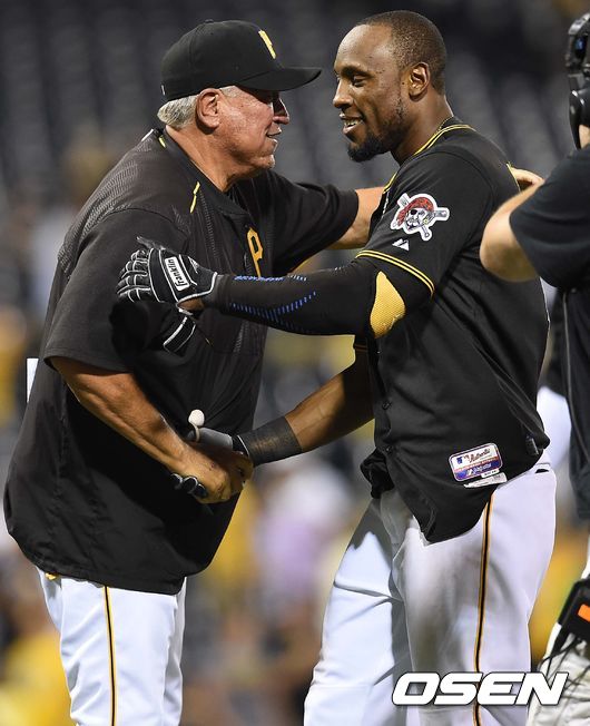 연장 13회 끝내기 안타로 클린트 허들 감독에게 900승을 선물한 스탈링 마르테(우측)/PNC 파크 (피츠버그)=최규한 기자 dreamer@osen.co.kr