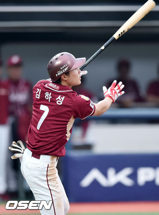 13일 오후 수원KT위즈파크서 열린 '2015 타이어뱅크 KBO 리그' kt 위즈와 넥센 히어로즈와의 경기, 3회초 무사 주자 1루 넥센 김하성이 좌중월 선취 투런홈런을 날리고 있다.