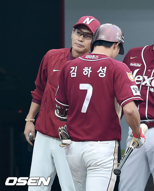 13일 오후 수원KT위즈파크서 열린 '2015 타이어뱅크 KBO 리그' kt 위즈와 넥센 히어로즈와의 경기, 3회초 무사 주자 1루 넥센 김하성이 좌중월 선취 투런홈런을 날린 후 덕아웃에서 염경엽 감독과 하이파이브를 하고 있다.