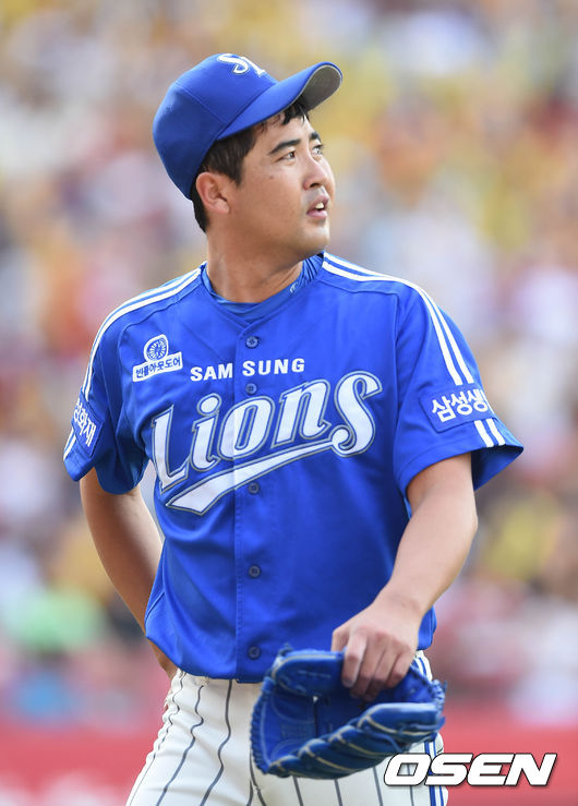 13일 오후 광주-기아 챔피언스 필드에서 열린 '2015 타이어뱅크 KBO 리그' KIA 타이거즈와 삼성 라이온즈의 경기, 3회말 1사 1,2루 삼성 장원삼이 KIA 최용규에게 2타점 적시타를 허용하고 교체되어 마운드를 내려가고 있다.