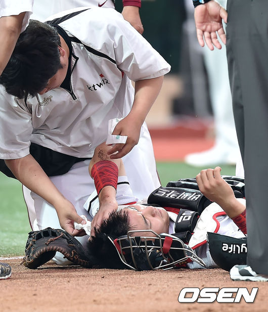 장성우는 13일 수원kt위즈파크에서 열린 '2015 타이어뱅크 KBO 리그' 넥센 히어로즈전에서 3회초 1사 1,2루 상황에서 수비 도중 박동원의 스윙 후 돌아가던 배트에 얼굴을 맞았다.