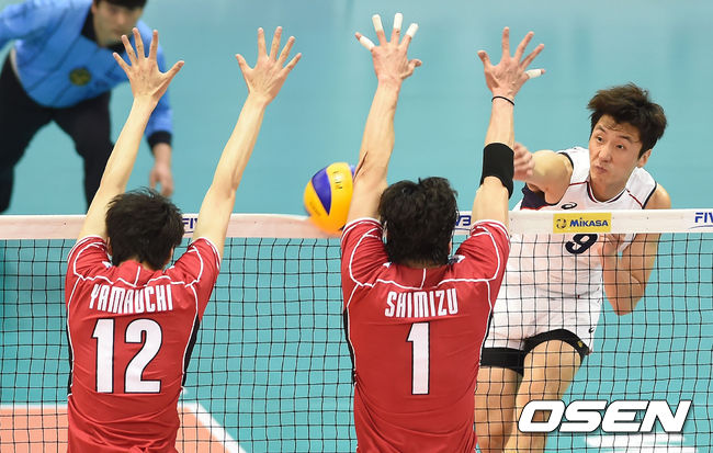 14일 오후 수원 실내체육관에서 열린 '2015 월드리그 국제남자배구' 한국과 일본의 경기, 일본의 시미즈 쿠니히로가 강타를 날리고 있다.