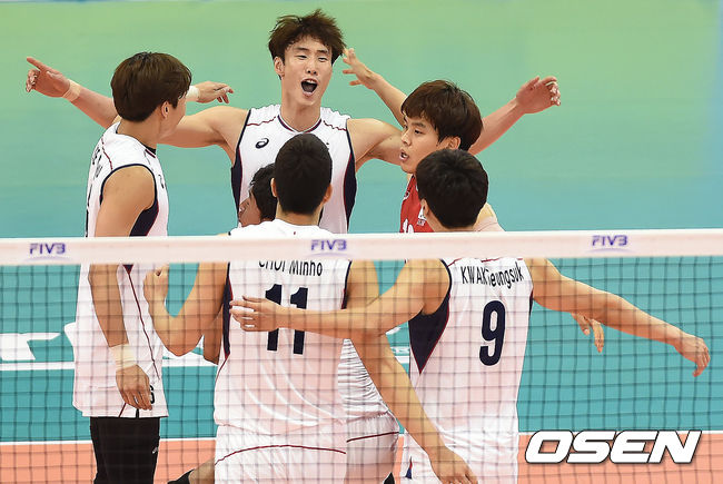 하지만 한국은 이민규의 2단 패스 페인트와 최홍석의 블로킹을 더해 더시 11-8로 도망갔다. 이후 2~3점의 리드가 계속 됐다. 한국은 18-15서 최홍석의 강력한 스파이크 서브에이스와 최민호의 블로킹을 더해 20-15로 달아났다. 이후 연이은 실책으로 추격을 허용했지만 상대의 서브 범실과 최홍석의 블로킹으로 1세트를 따냈다.