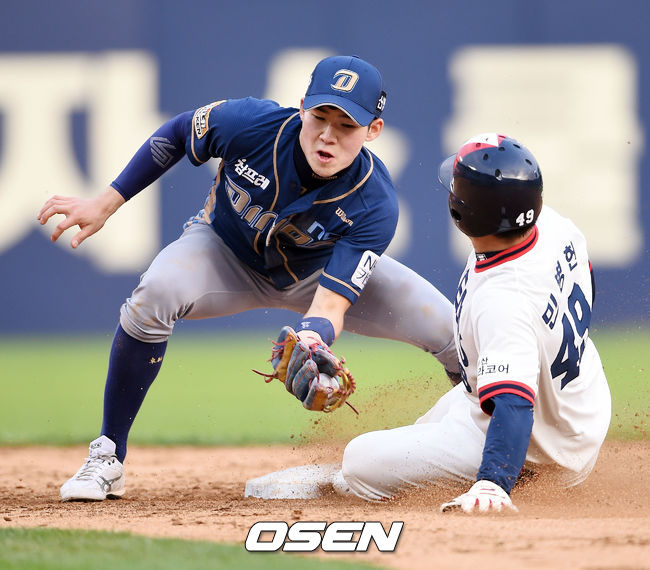 14일 오후 잠실구장에서 열린‘2015 타이어뱅크 KBO리그’ 두산 베어스와 NC 다이노스의 경기,4회말 2사 1루 두산 정수빈의 타석때 1루 주자 민병헌이 도루 성공하고 있다.