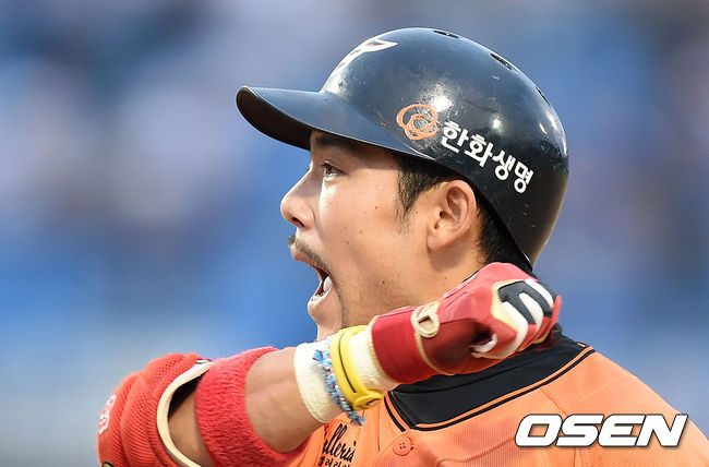 6회말 1사 만루에서 한화 이용규가 1타점 역전 적시타를 날리고 기뻐하고 있다. 이용규는 1,300안타를 달성했다.