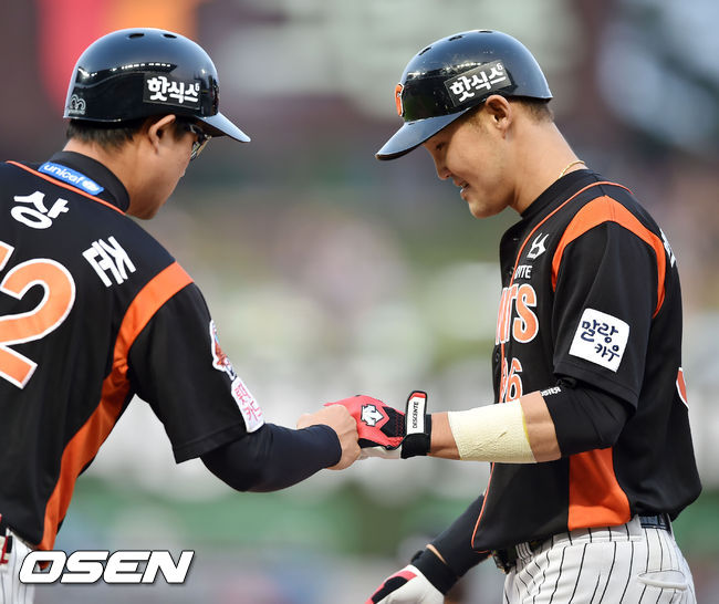 14일 오후 인천SK 행복드림구장서 열린 '2015 타이어뱅크 KBO 리그' SK 와이번스와 롯데 자이언츠의 경기, 9회초 1사 주자 만루 롯데 박종윤이 2루수 땅볼로 선취 타점을 올린 후 1루에서 안상준 코치와 하이파이브를 하고 있다.