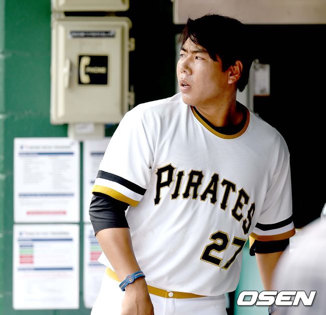 4회말 피츠버그 공격 무사 1루 상황 4번 타자 강정호가 필라델피아 선발 콜 헤멀스의 공에 서서 삼진을 당한 뒤 더그아웃에서 장비를 벗고 있다.